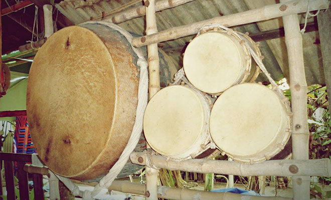 ๑ . กลองปูชา ( อ่าน ” ก๋องปู๋จา ”) คือกลองบูชา เดิมเรียกว่ากลองนันทเภรี เป็นกลองขึ้นสองหน้าขนาดใหญ่ตั้งอยู่กับที่ แต่ใช้ตีหน้าเดียว มีหน้ากว้างประมาณ ๓๐ นิ้วขึ้นไป ปกติจะตั้งไว้ที่ศาลาไว้กลองหรือตั้งไว้ภายในวัดประกอบด้วยกลองขนาดใหญ่ ๑ ใบ ซึ่งมีขนาดหน้ากลองเส้นผ่าศูนย์กลางประมาณ ๑ เมตร ความยาวของตัวกลองประมาณ ๑ . ๕ เมตร และกลองขนาดเล็ก เรียกว่า “ กลองแสะ ” หรือ “ ลูกตุบ ” อีก ๒ – ๓ ใบ ซึ่งมีขนาดลดหลั่นกัน กลองปูชาใช้ตีเป็นพุทธบูชาในโอกาส เกี่ยวกับพิธีกรรมทางพุทธศาสนา เช่น วันขึ้นหรือแรม ๗ ค่ำ และ ๑๔ ค่ำ ระหว่างเข้าพรรษา เป็นต้น บางแห่งใช้ตีเป็นสัญญาณบอกเวลาด้วย เวลาตีกลองปูชา จะใช้ผู้ตี ๒ คน คนหนึ่งใช้ไม้ค้อนตี ๒ มือ ตีทั้งกลองใหญ่และกลองเล็ก เป็นทำนองต่าง ๆ อีกคนหนึ่งใช้ไม้แสะ ( ไม้ไผ่ผ่าซีกจักปลาย ) ตีขัดจังหวะกลองยืนทำนองไปตลอด นอกจากนี้หากเป็นการตีประกวดกัน ก็ยังมีคนตีฆ้อง โหม่ง และฉาบ ประกอบด้วย