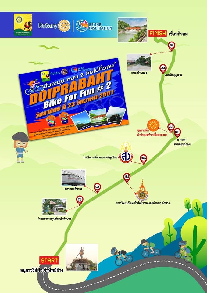 งานปั่น Doiprabaht Bike for fun 2 เรียนเชิญนักปั่นจังหวัดลำปางและจังหวัดใกล้เคียง ร่วมปั่นทริปมหากุศล Doiprabaht Bike For Fun # 2 “ปั่นละมุน หมุน 2 ล้อไปกิ่วลม” ค่าสมัคร 600 บาท รับเสื้อปั่น 1 ตัว เหรียญที่ระลึก