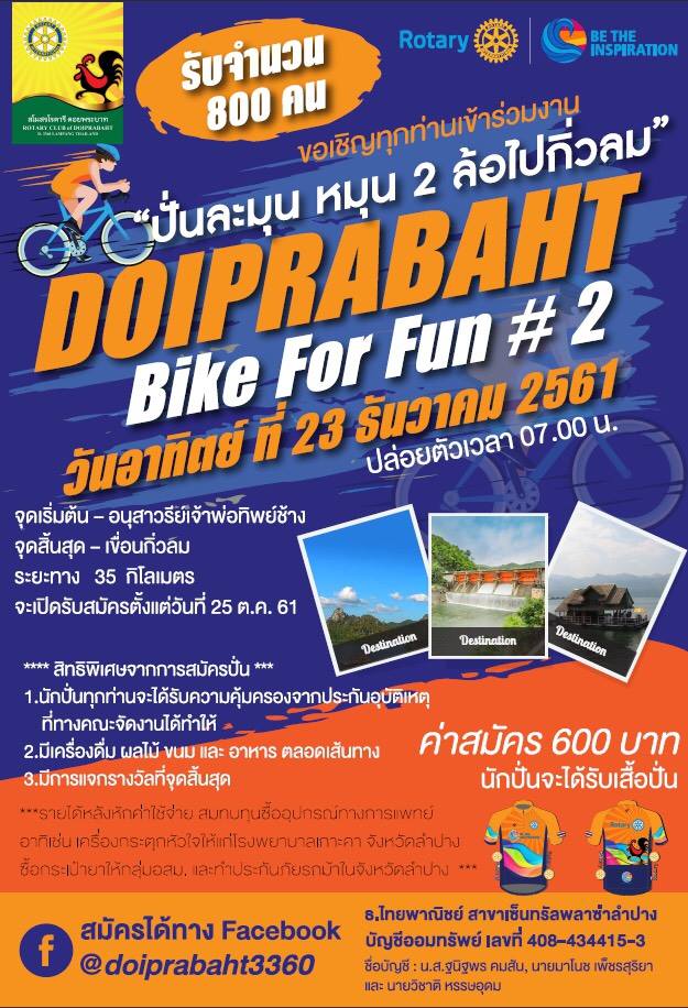 23 ธันวาคม 2561เรียนเชิญนักปั่นจังหวัดลำปางและจังหวัดใกล้เคียง ร่วมปั่นทริปมหากุศล Doiprabaht Bike For Fun # 2 “ปั่นละมุน หมุน 2 ล้อไปกิ่วลม” ค่าสมัคร 600 บาท รับเสื้อปั่น 1 ตัว เหรียญที่ระลึก บริการน้ำดื่ม ผลไม้ ขนม อาหาร เปิดรับสมัครตั้งแต่วันที่ 25 ตุลาคม 2561 เป็นต้นไป รายได้หักค่าใช้จ่ายแล้วสบทบทุนซื้ออุปกรณ์ทางการแพทย์อาทิเช่นเครื่องกระตุกหัวใจให้แก่โรงพยาบาลเกาะคา จังหวัดลำปาง ซื้อกระเป๋ายาให้กลุ่ม อสม. และทำประกันภัยรถม้าในจังหวัดลำปาง..